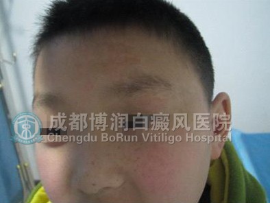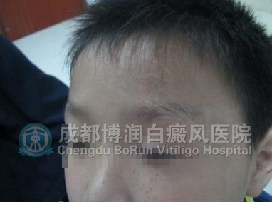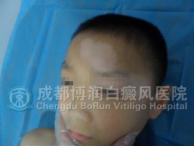 ▲病 史:患儿家属4个月前发现额部白斑,在当地医院治疗,被误诊为癣,外用药治疗未果,后越发越多,今日来我院治疗。