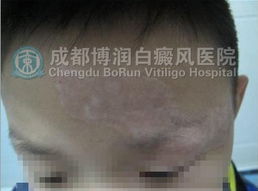 (2月5日,初诊时,患者额头处白斑明显,色素完全性脱失,边缘清晰)