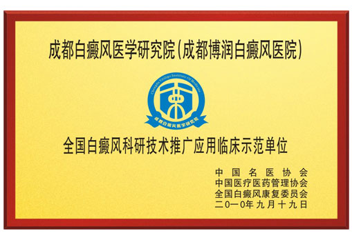 作为国家在西南重点设置的白癜风理论科研与临床诊疗机构,该院承担着西南上亿人民群众皮肤健康的责任与全国先进白癜风科研技术在西南地区的落地与推广应用。2011年9月经中国名医协会、中国医疗医药管理协会、全国白癜风康复委员会的三方权威考评,颁于成都白癜风医学研究院附属博润医院“全国白癜风科研技术推广应用临床示范基地”的称号。