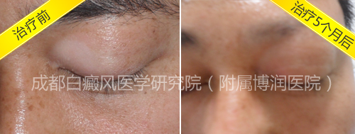 上图所示的就是在我院治疗的白癜风患者,他的白斑也是在眼角部位,采用我院最新引进的GX-B分型多维白癜风康复工程,五个月后完全康复。